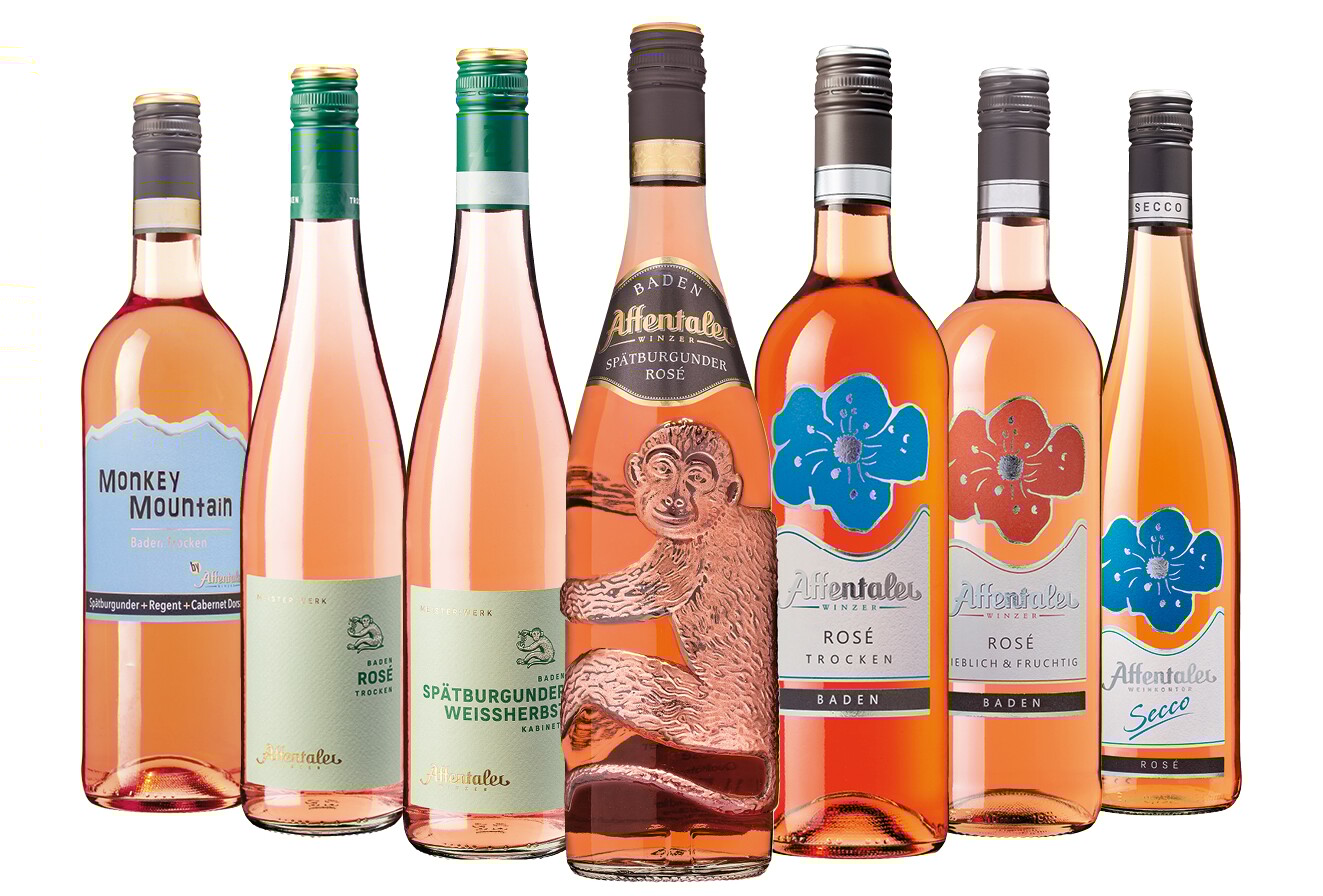 Filigrane leichte Roséweine sind im Trend. Sie verbinden die Fruchtigkeit der roten mit der Frische der weißen Weine. Der Roséwein, der ursprünglich aus der Provence kommt, ist als Sommer- und Terrassenwein auch in unserer Region als aparter und adretter Begleiter nicht mehr wegzudenken. Die geschmackliche Vielfalt reicht von zart duftend feinherb bis zu kraftvoll und dynamisch. Die Affentaler Roséweine überzeugen auch immer durch ihre elegante Frische auf dem Gaumen. Sie sind ein wahrer Trinkgenuss sowohl als Spätburgunder Rosé als auch als Cuvée aus den Trauben Spätburgunder & Regent & Cabernet Dorsa, wie sie in der Linie Monkey Mountain zu finden sind, als auch bei unsrem Exoten, dem No1 der mit einem Merlot & Sauvignon Blanc vermählt ist.